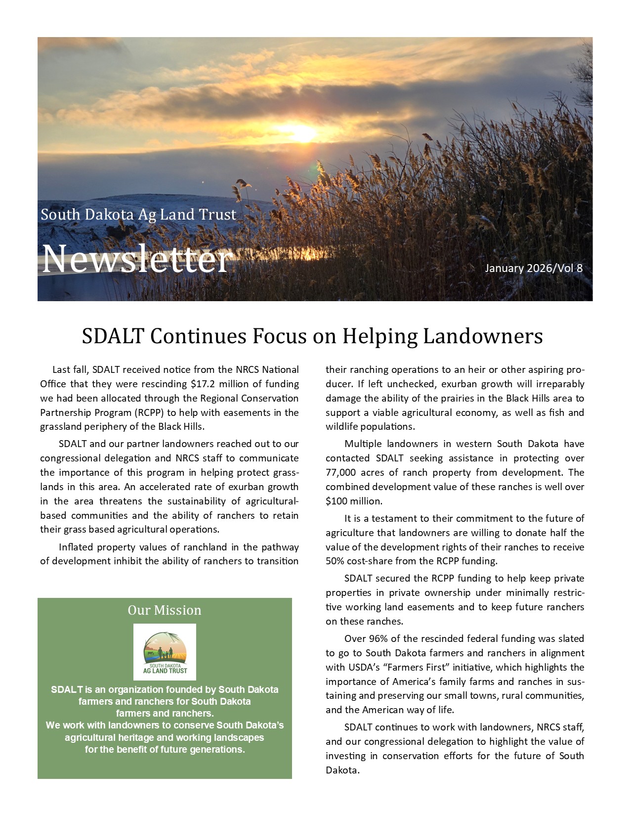 Explore the latest news and updates from the South Dakota Ag Land Trust through our engaging newsletters. Stay informed, inspired, and connected with our mission to preserve our South Dakota heritage from one generation to the next. Donate today to support our important work in protecting agricultural land for the future.